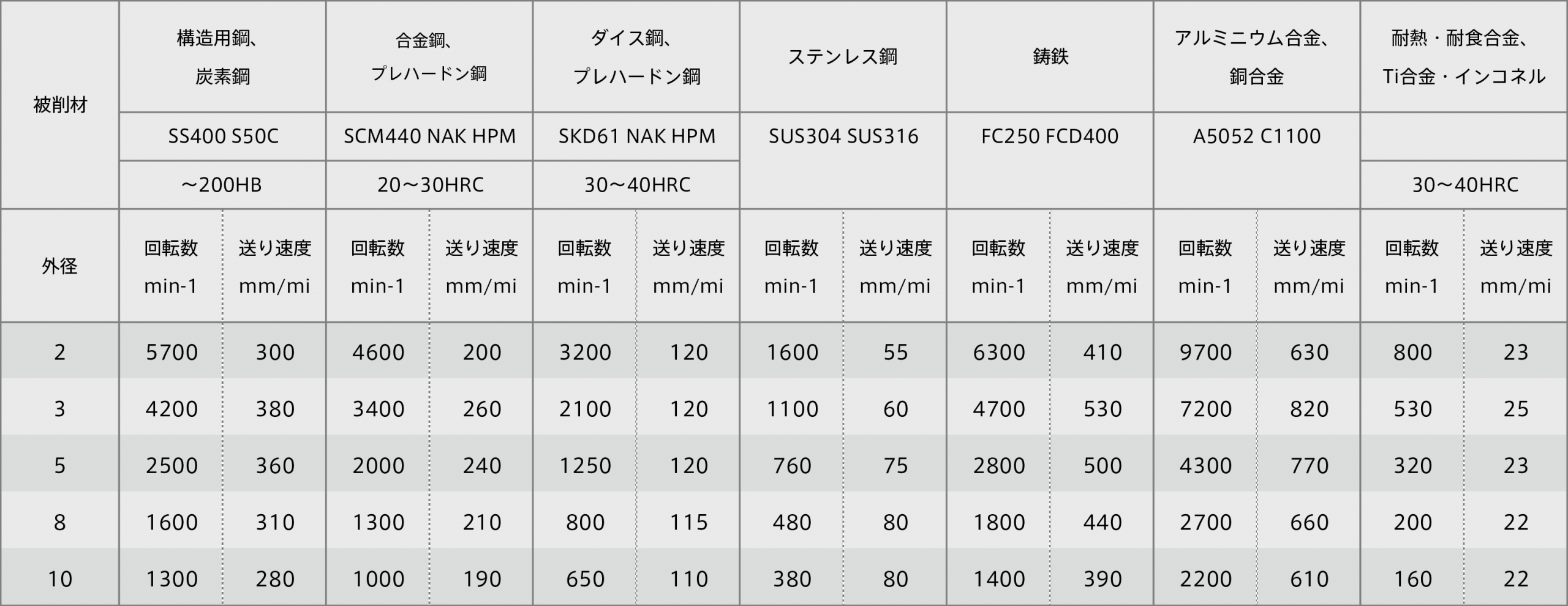 切削条件ご利用の注意 1)機械剛性やワーククランプ、加工形状などの状況により切削条件を調整して下さい。 2)この切削条件は水溶性切削油剤を使用した場合です。不水溶性切削油剤を使用する場合には回転数と送り速度を20%下げて下さい。 3)切削油剤は加工点やドリル溝へ十分に供給して下さい。 4)ステンレス鋼を加工する場合にはステップ加工を行って下さい。 5)ステップ送りは穴の上面まで戻して下さい。 6)ステップ量は0.5D~1Dを目安にして下さい。小径は0.2~0.5Dぐらいです。 7)コレットチャック、ミーリングチャックを使用下さい。 8)TZESRをご使用で穴あけ深さが3Dを超える場合には回転数と送り速度を20%下げて下さい。 9)TZESRをご使用で穴あけ深さが3Dを超える場合にはステップ加工を行って下さい。 ただし、被削材や加工条件により切くず排出性が悪くなることがあります。その場合には所定の穴深さ以下であってもステップ加工を行って下さい。
