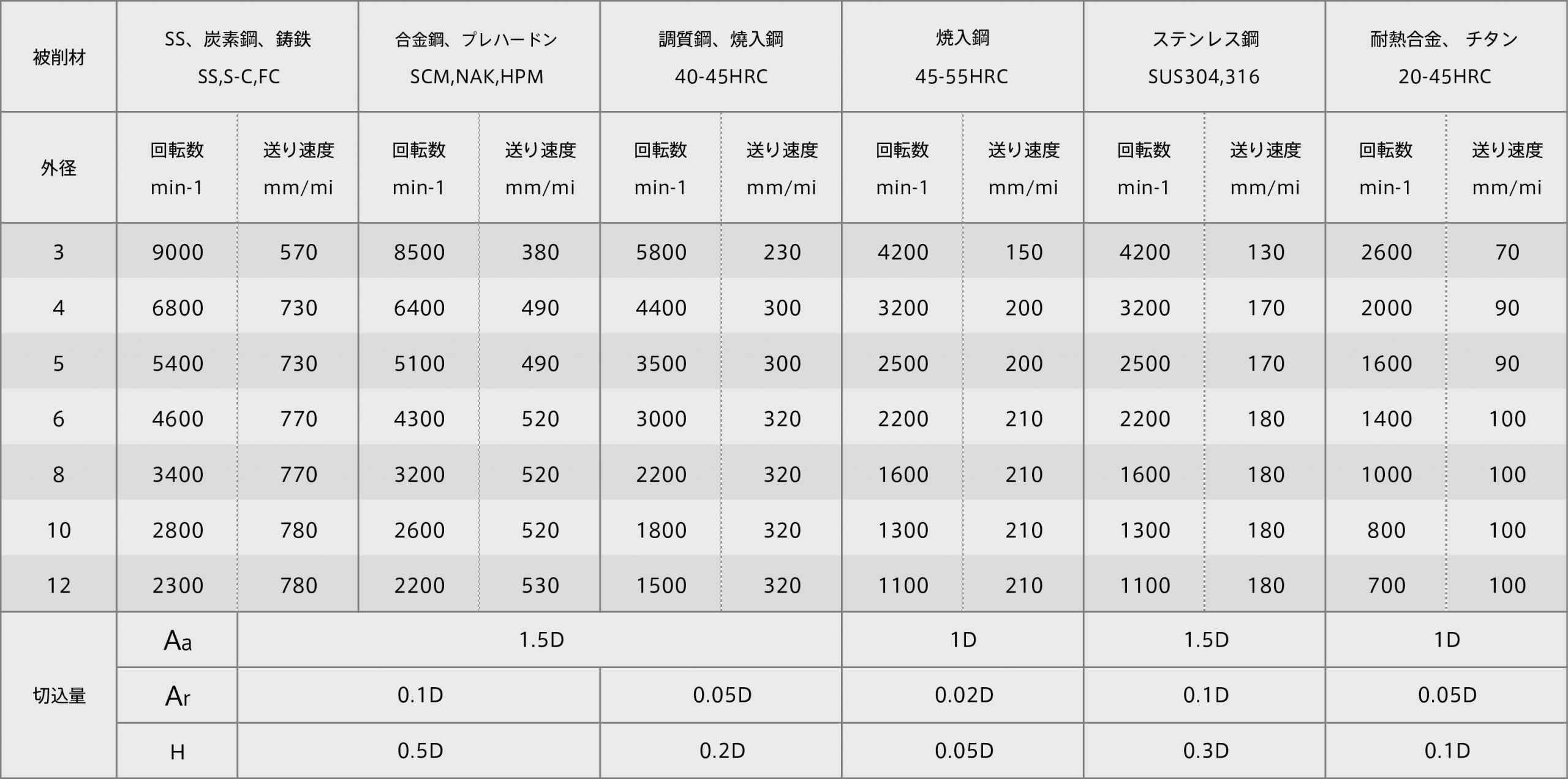 切削条件ご利用の注意 1) 安定した加工を行うため、剛性のある機械・ホルダーを使用ください 2) ステンレス鋼の溝加工の場合は、 回転数を60% 送り速度を40%にしてください 3) ステンレス鋼、 耐熱合金、 チタン合金を加工する場合はウェットで加工してください 4) 状況に応じて、 切削条件を調整する場合は、 回転数と送りを同率で落としてください